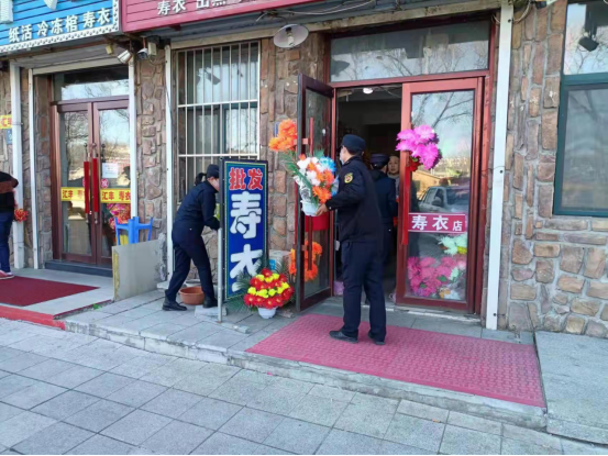 行动中,针对部分商家为招揽顾客,将鲜花等多种祭祀用品摆放在门口进行销售经营的行为,县城管局执法人员对其进行批评教育并责令整改。